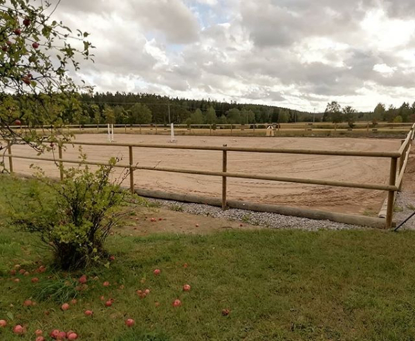 Meiltä löytyy kaksi pientä tallia sekä kaksi ulkokarsinaa, tarhat, pieni laidun sekä hieno uusi kenttä laajalla estekalustolla. Alla kuvia: